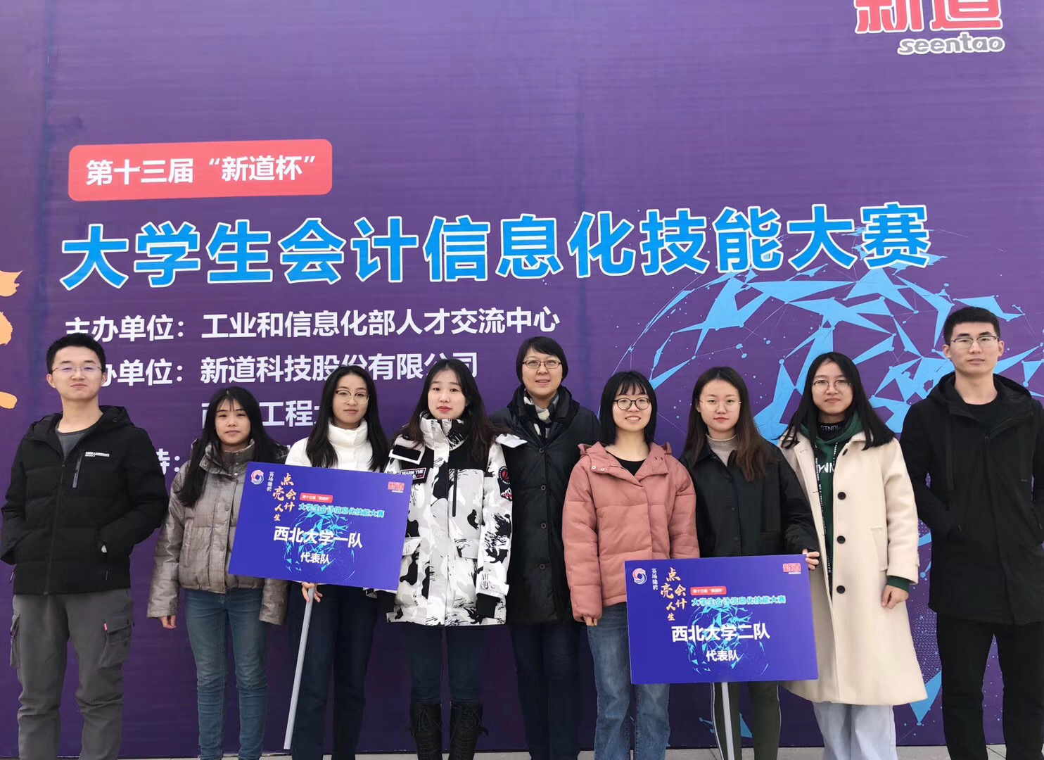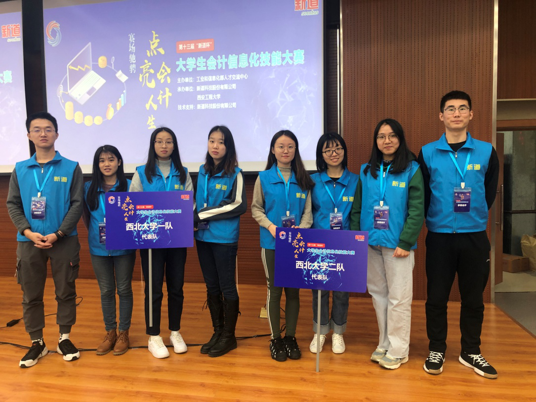 2019年12月7日,李辉老师和潘颖老师带领2017级会计班8名同学(万军、刘红娟、杨秋凤、李宇初、张帅、韩洁琳、闫晴、王露)于西安工程大学临潼校区参加了第十三届“新道杯”大学生会计信息化技能大赛,这8名同学组成两队代表永利集团3044欢迎光临参赛,在大赛中脱颖而出均获得团体一等奖。
