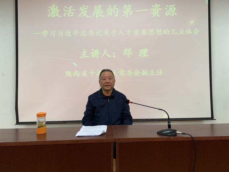 杜勇主持活动时代表学院对邓理副主任来院讲座表示热烈欢迎。他说,全党正在开展“不忘初心,牢记使命”主题教育,希望每一位同学把本次报告作为学习习近平总书记人才思想的一次导读,深刻理解人才是第一资源的深刻含义,把自己和国家的命运紧紧结合在一起,找准个人定位,树立“人人皆可成才、人人尽展其才”的理念,为实现中华民族的伟大复兴做出自己的贡献。