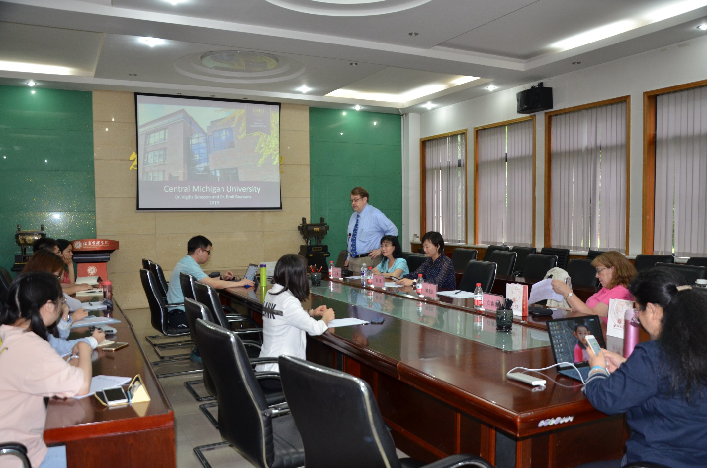 6月28日,中密歇根大学商学院工商信息系统教授Emil Boasson、金融和法律系法律教授Nancy White、金融和法律系金融教授Vigdis Boasson来访永利集团官网,与院长吴振磊教授、信息管理与信息系统系副主任高鹏副教授、实验中心主任高原副教授、院长助理康蓉副教授及学校国际项目管理办公室刘园老师召开座谈会。首先,双方介绍了各自学院的基本情况。中密歇根大学是一座历史过百年的美国州立综合性大学,其领域涉及工商、教育、医疗等各个方面。之后,Emil Boasson教授重点介绍了其优势学科——商业信息系统科学硕士(MSIS)及其培养内容为企业资源规划软件SAP,高原副教授也介绍了永利集团官网在该领域的教学工作开展情况,双方商定以此为基础,进行师资、学生、科研等领域的合作。随后双方又就具体合作内容与方式做了进一步沟通。