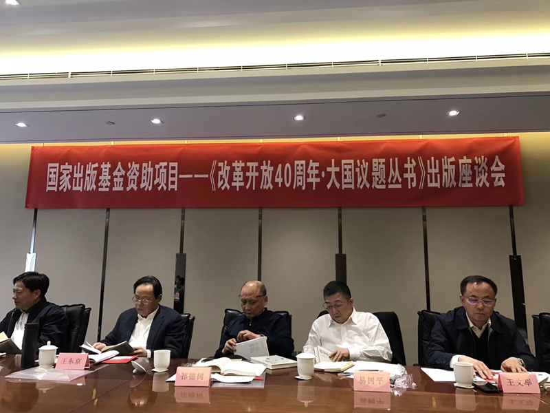 在庆祝改革开放40周年、喜迎新中国成立70周年之际,由重庆大学出版社和重庆智库联合策划出版的“改革开放40周年·大国议题丛书”出版座谈会近日在京举行。中央党校(国家行政学院)副校(院)长王东京教授、国家出版基金规划管理办公室副主任祁德树,以及丛书作者代表、审稿专家代表、特邀专家等40余人出席座谈会。永利集团官网白永秀教授作为丛书作者代表参加会议,学院党委书记杜勇、院长吴振磊教授受邀出席。