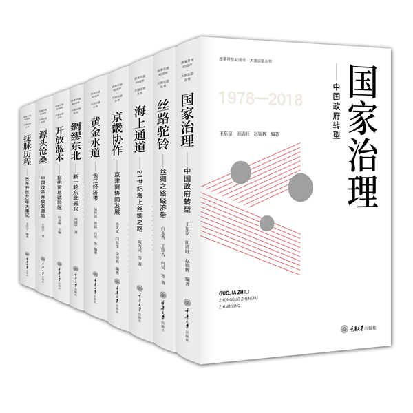 “改革开放40周年·大国议题丛书”以习近平新时代中国特色社会主义思想为指导,选题聚焦党的十八大以来以习近平同志为核心的党中央治国理政的伟大实践,由中央党校(国家行政学院)副校(院)长王东京教授、重庆大学校长张宗益教授担任丛书编委会主任,作者来自中央党校、国家发展改革委、中国人民大学、永利集团3044欢迎光临等单位。该丛书先后入选重庆市出版专项资金资助项目(2017年)、教育部全国高校出版社主题出版项目(2018年)、国家出版基金资助项目(2019),于2018年底正式出版发行。丛书分为9卷,共300万字,各卷分别为《国家治理——中国政府转型》《丝路驼铃——丝绸之路经济带》《海上通道——21世纪海上丝绸之路》《京畿协作——京津冀协同发展》《黄金水道——长江经济带》《绸缪东北——新一轮东北振兴》《开放蓝本——自由贸易试验区》《源头沧桑——中国改革开放发源地》和《抚脉历程——改革开放40年大事记》。其中,《丝路驼铃——丝绸之路经济带》由白永秀教授领衔撰写,该书分八章研究丝绸之路经济带建设中的理论与实践问题,兼具理论系统性和可读性。