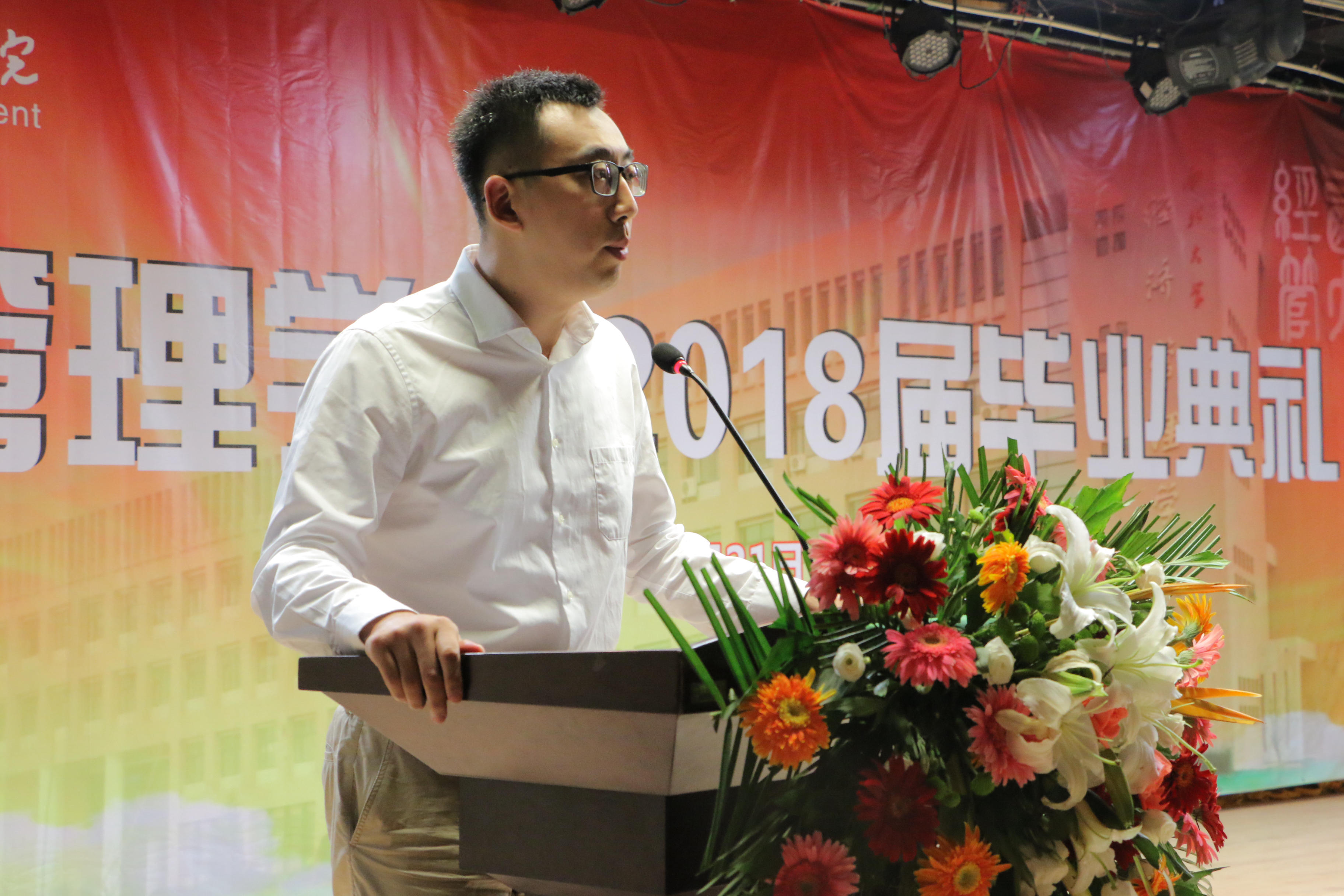 经济学系吴丰华老师代表教师发言,吴老师用亚当斯密的经济学原理和马克思的等价交换原则等经济学知识向同学们阐述做人做事的道理,从学者、企业家、政治家的角度,利用知识迭代和知识周转的原理,来诠释个人价值创造的重要性。最后给予同学们最真诚的毕业祝福。吴老师的发言生动有趣,不时迎来教师、同学们的掌声。