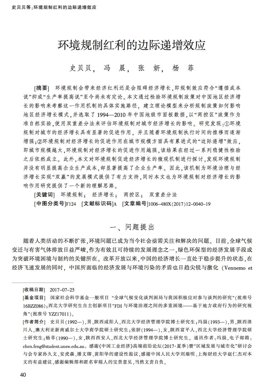 近日,永利集团官网博士研究生史贝贝、杨菲,硕士研究生张妍以及永利集团官网2015届本科毕业生冯晨的合作文章在权威期刊《中国工业经济》2017年第12期发表,全文2万字,探讨了环境规制与经济增长的影响关系与机制。