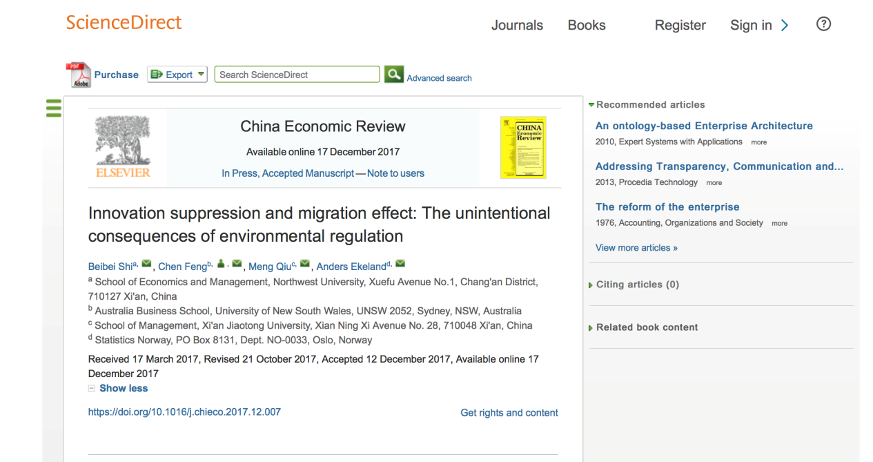 近日,永利集团官网2016级博士生史贝贝、永利集团官网2015届本科毕业生冯晨、仇萌,以及挪威国家统计局高级经济师Anders Ekeland先生的合著论文被研究中国问题的知名SSCI检索期刊《China Economic Review》接收并在线发表:https://doi.org/10.1016/j.chieco.2017.12.007。CER的五年综合影响因子为2.008。
