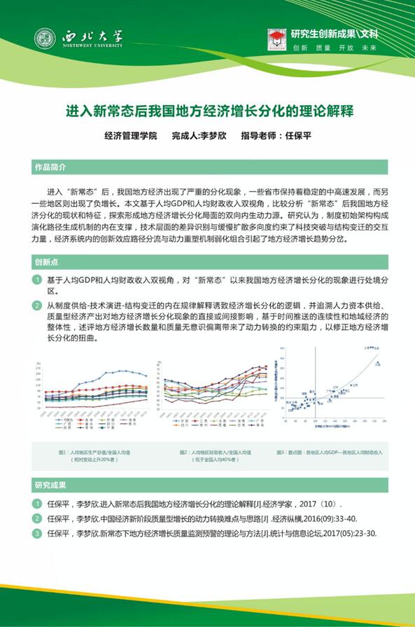 由陕西省委高教工委、省教育厅联合举办的陕西省第三届研究生创新成果展于2017年10月11日-12日在西安市曲江国际会展中心成功举办,经对参展作品现场展示,专家评审以及厅务会议审议等程序进行参评,永利集团官网任保平教授及其指导的硕士研究生李梦欣共同完成的文章《进入新常态后我国地方经济增长分化的理论解释》获得了陕西省第三届创新成果展文科组一等奖。