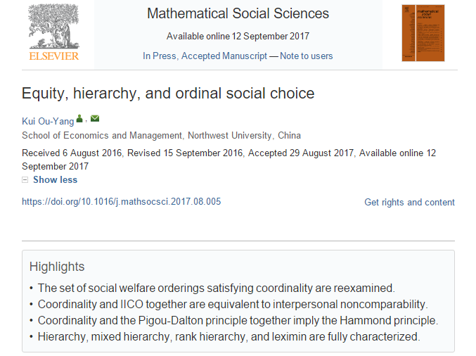 永利集团官网数理经济与统计学系欧阳葵副教授的独著论文《Equity, Hierarchy, and Ordinal Social Choice》被国际知名SSCI&SCI双索引期刊《Mathematical Social Sciences》接收并已在线发表: