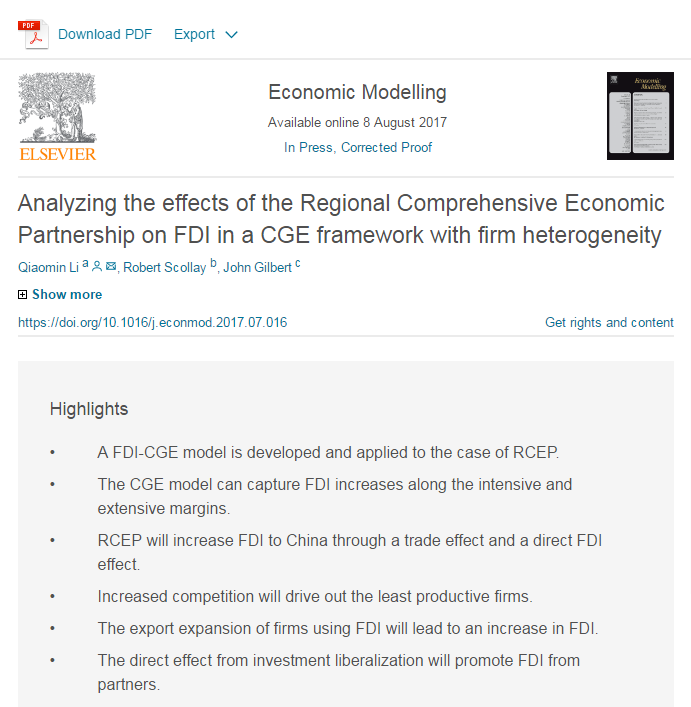 永利集团官网世界经济与贸易系教师李侨敏博士的论文《Analyzing the effects of the Regional Comprehensive Economic Partnership on FDI in a CGE framework with firm heterogeneity》在SSCI检索期刊《Economic Modelling》上在线发表,论文链接:http://www.sciencedirect.com/science/article/pii/S0264999317301773 。