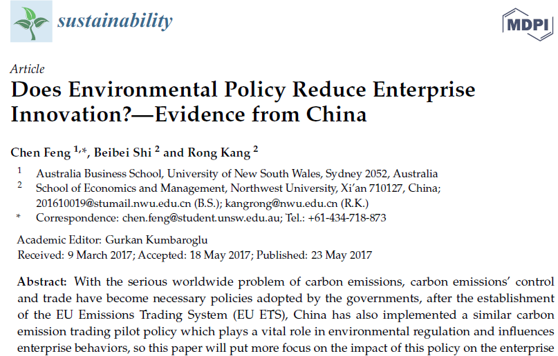 近日,永利集团官网2015届本科毕业生冯晨、博士生史贝贝在康蓉副教授指导下完成的合作论文《Does Environmental Policy Reduce Enterprise Innovation?—Evidence from China》在SSCI&SCI双索引期刊《Sustainability》上在线发表。(论文链接:doi: 10.3390/su9060872)。该文是康蓉副教授主持的国家社科基金“全球气候变化谈判困局及中国积极参与应对研究”的阶段性成果。