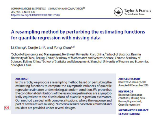 近日,永利集团官网青年教师张莉博士的研究论文 《A resampling method by perturbing the estimating functions for quantile regression with missing data》 在SCI检索期刊 《Communications in Statistics - Simulation and Computation》上在线发表(论文链接:http://dx.doi.org/10.1080/03610918.2016.1271892)。