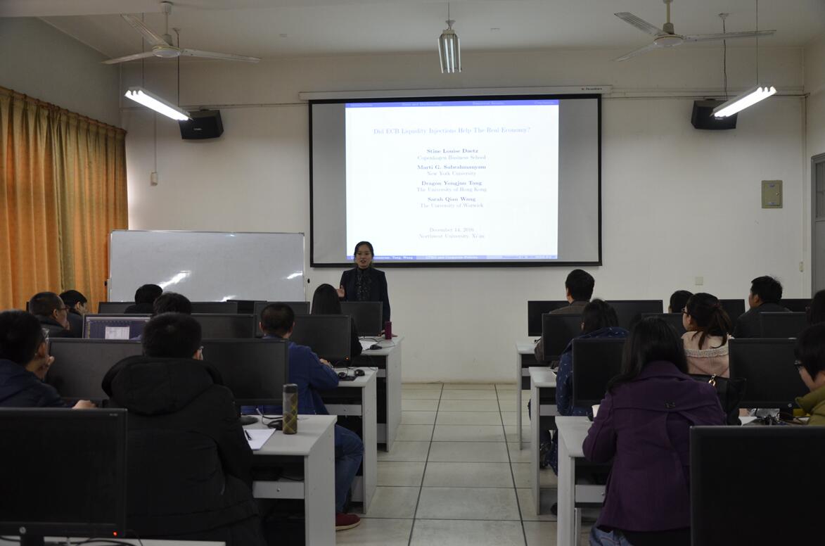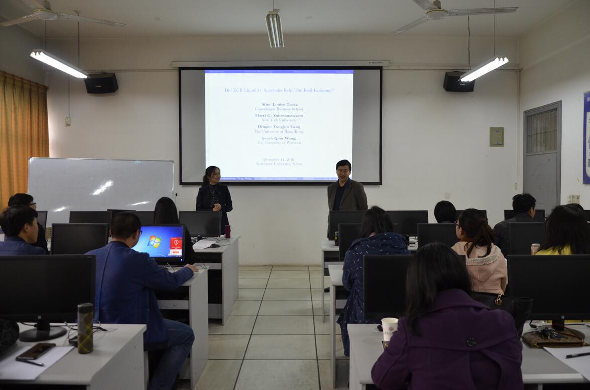 经济类教师学术沙龙2016年第4期(总第82期)于2016年12月14日下午在永利集团3044欢迎光临长安校区8110教室举行。任教于英国华威大学的王倩博士应邀以《欧洲央行的流动性注入如何影响实体经济》为题,向参加活动的学院师生作了报告。本次沙龙由金融系副主任王峰虎副教授主持,金融系俞颖副教授点评,多名青年教师及永利集团官网部分硕士研究生参加了本次沙龙。