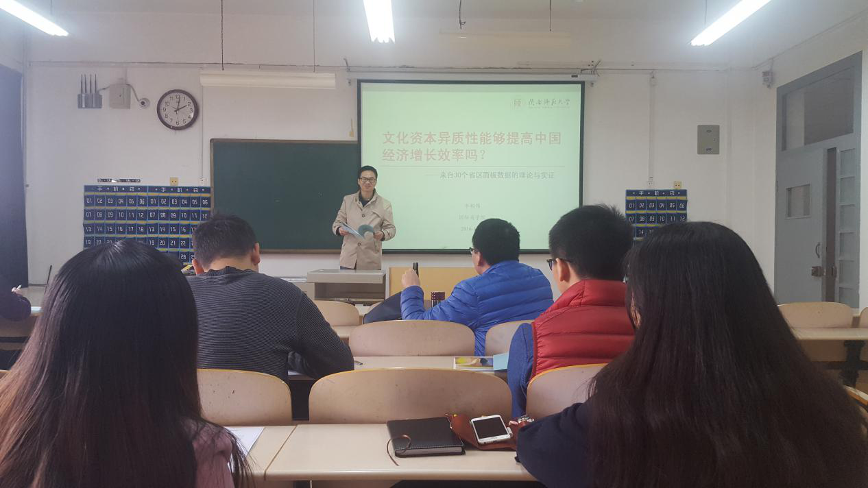 2016年11月9日下午,永利集团3044欢迎光临现代经济学理论与方法创新论坛第十二卷第六期在长安校区2号楼2310教室成功举行。陕西师范大学国际商学院的李娟伟老师对题为《文化资本异质性能够提高中国经济增长效率吗?——来自30个省区面板数据的理论与实证》的学术论文进行了汇报。报告由会计学系李辉老师主持,博硕士和本科生二十余人参加了本次讨论。
