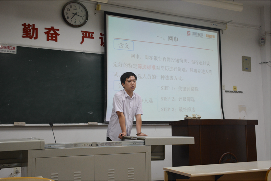 近期即将迎来银行类单位的招聘高峰,9月28日晚上7点,学院邀请华图教育金融培训专家在南校区1309教室为本科毕业生做了关于银行应聘的指导讲座。老师们为学生详细解读了2016年秋季银行招聘笔试大纲,并用真题为例为同学们讲解银行考试各模块的解题技巧和方法,指导毕业生如何根据自己的实际情况制定复习和备考计划。讲座中,老师还穿插了一些银行从业考试的介绍,以及银行内部转岗考试等相关内容。讲座为银行方向的毕业生提供了大量信息,帮助学生了解当前银行考试的复习要点,理解银行招聘考试中的重点、难点,提高应聘成功率。