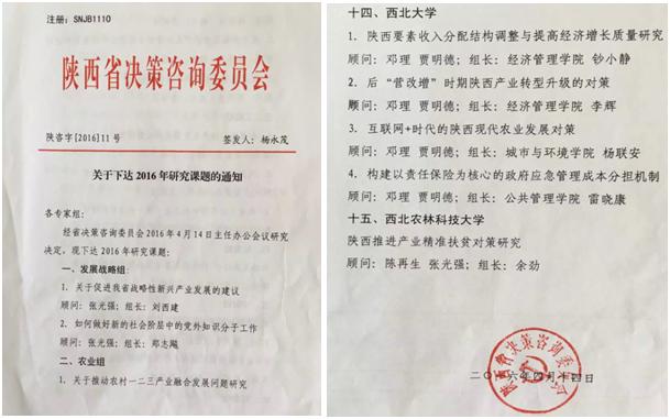 2015年,永利集团官网通过“陕西发展高层论坛”向省决策咨询委员会推荐选题。经过严格筛选并征询省级领导意见,省决策咨询委员会主任办公室会议研究决定立项。推荐选题立项进一步显示了“陕西发展高层论坛”服务地方经济社会发展、打造高校智库的宗旨,凸显了永利集团官网为陕西省各级党委、政府提供政策咨询服务的能力。