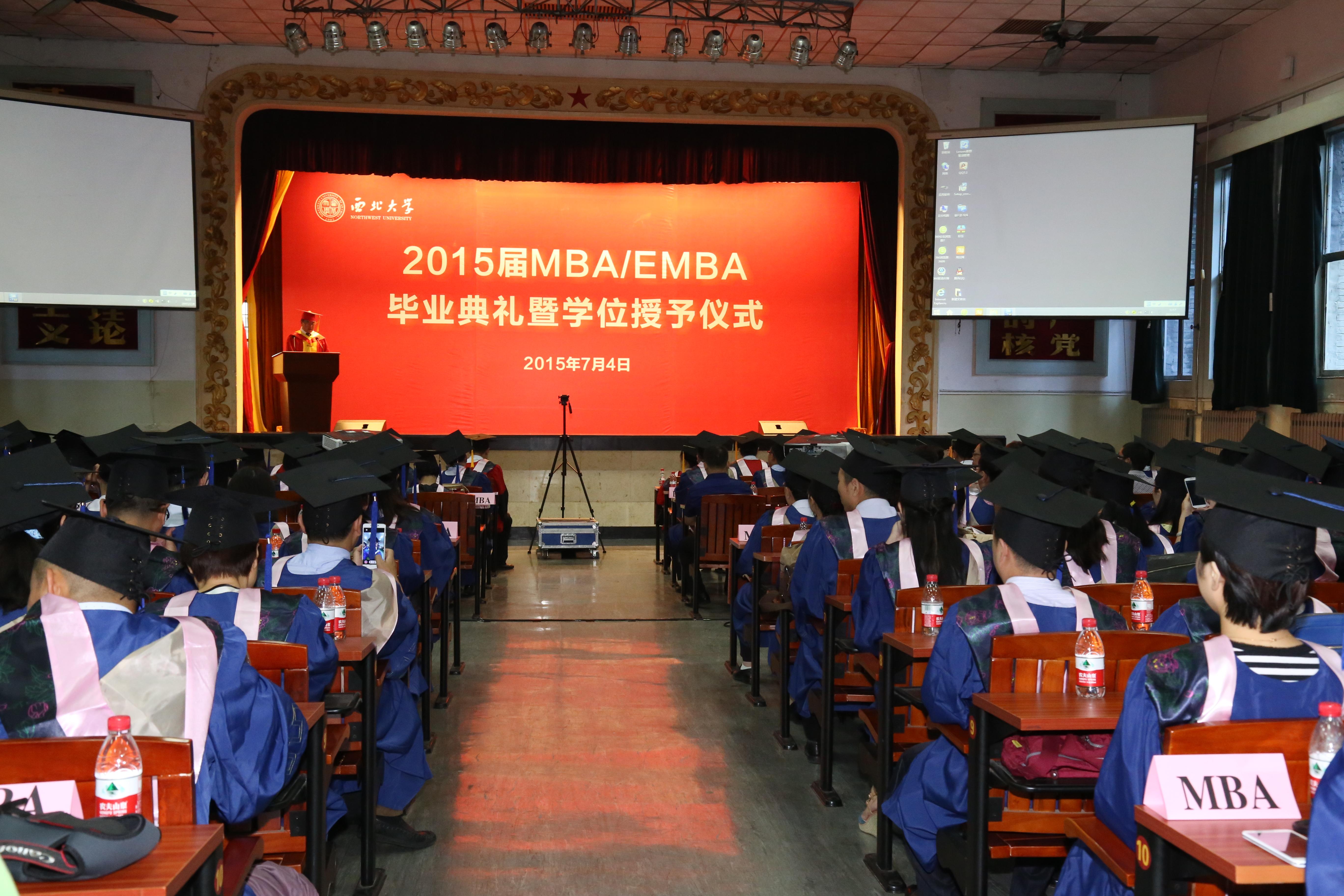 2015年7月4日上午,2015届MBA/EMBA毕业典礼暨学位授予仪式在我校太白校区大礼堂举行。校长郭立宏、学院党政班子成员、学院各系(中心)主任出席了仪式,MBA、EMBA毕业生400余人参加了此次活动。