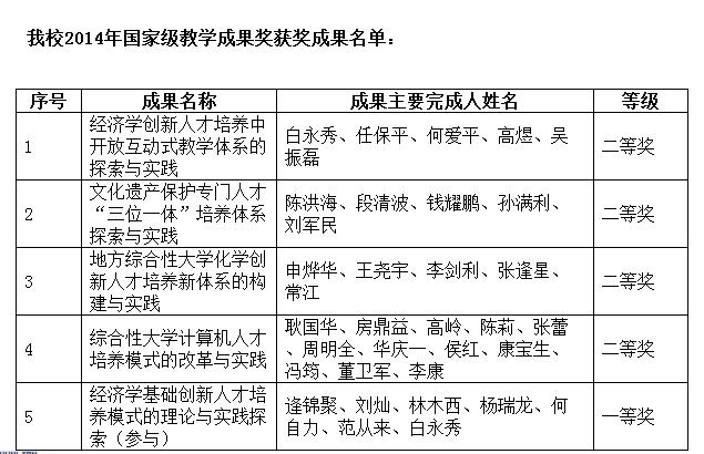 近日,2014年国家教学成果奖评选结果公布,永利集团官网白永秀、任保平、何爱平、高煜、吴振磊五位老师完成的《经济学创新人才培养中开放互动式教学体系的探索与实践》荣获2014年国家级教学成果奖二等奖。白永秀教授作为参与人完成的《经济学基础人才培养模式的理论与实践探索》获国家级教学成果奖一等奖。由白永秀教授、任保平教授主编的《中国市场经济理论与实践》(高等教育出版社,第二版)入选第二批“十二五”普通高等教育本科国家级规划教材,这是永利集团官网教材建设的标志性成果。
