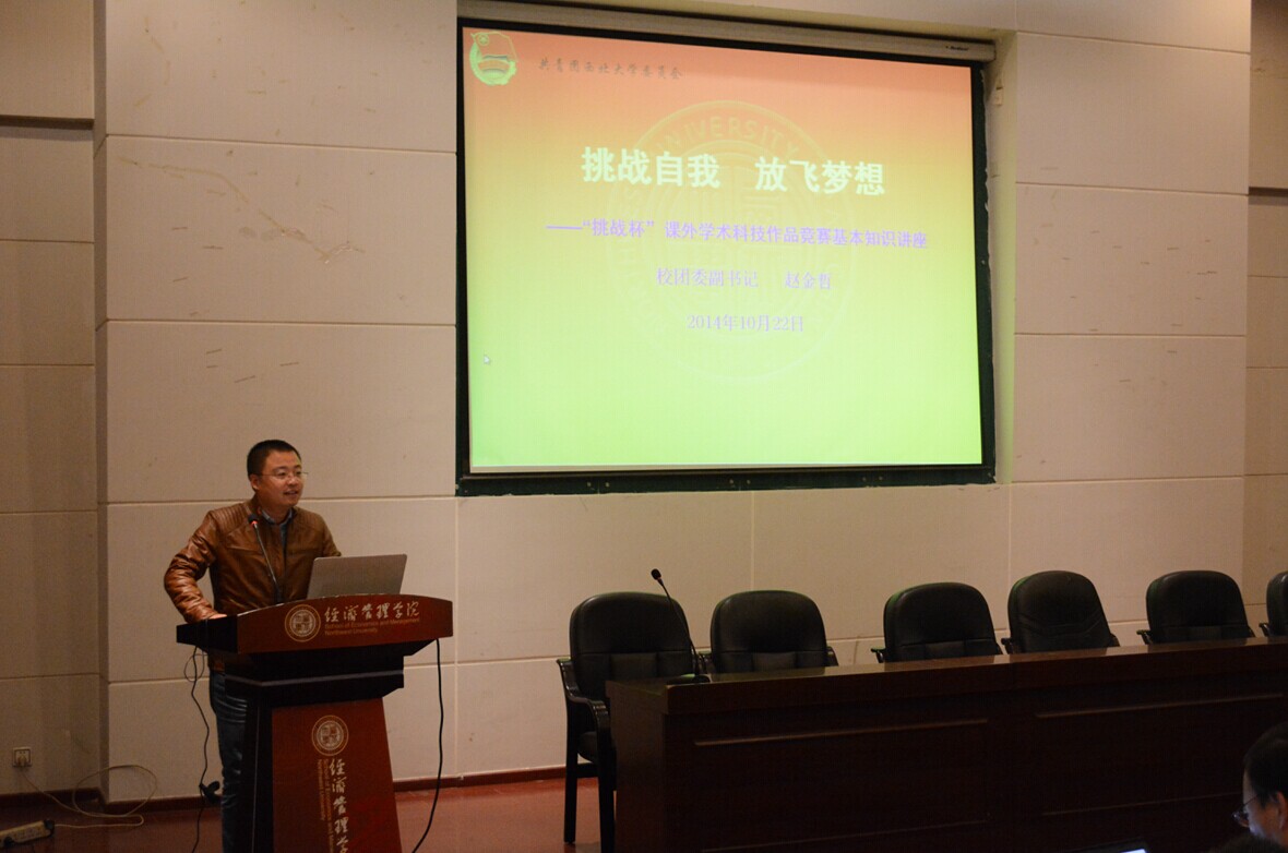 讲座中,赵金哲老师首先就“挑战杯”课外学术科技作品竞赛作了参赛辅导,赵老师分管我校共青团大学生课外科技工作,多次带队参加“挑战杯”全国竞赛,他就“挑战杯”赛事介绍、我校历届参赛获奖情况、校第七届“挑战杯”基本安排等几个方面作了详细解读,特别就如何准备挑战杯竞赛作品和参赛注意事项作了重点讲解,他从“参赛要求”、“作品选题的范围”、“作品评选的基本原则”、“竞赛安排”等四个方面向在场学生作了深入辅导。最后,他向学生讲述了参加“挑战杯”的意义,鼓励永利集团官网学生充分利用大学时光,挑战自我、积极参赛,全面提高自身的综合素质。