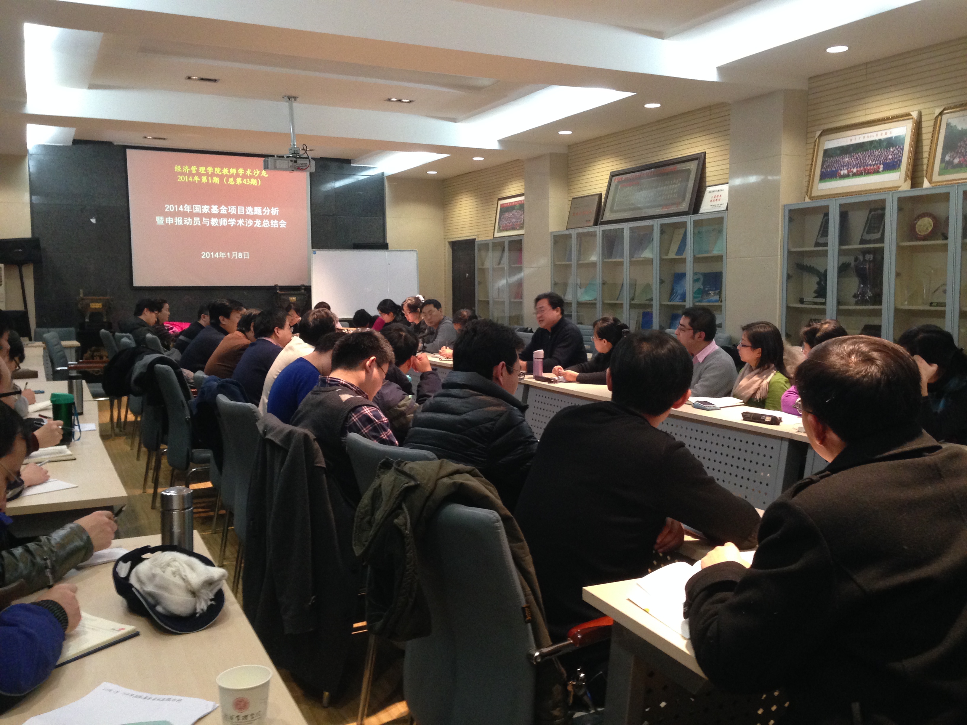 2014年1月8日永利集团3044欢迎光临教师学术沙龙2014年第1期在北校区永利集团3044欢迎光临311举行。本期学术沙龙的主题是“2014年国家基金项目选题分级——暨项目申报动员与学术沙龙总结会”。永利集团3044欢迎光临社科处处长刘丰教授、永利集团3044欢迎光临院长任保平教授、何爱平教授、安立仁教授、茹少峰教授、杜勇副院长、吴振磊副院长及学院教师60余人参加了本次学术沙龙活动。