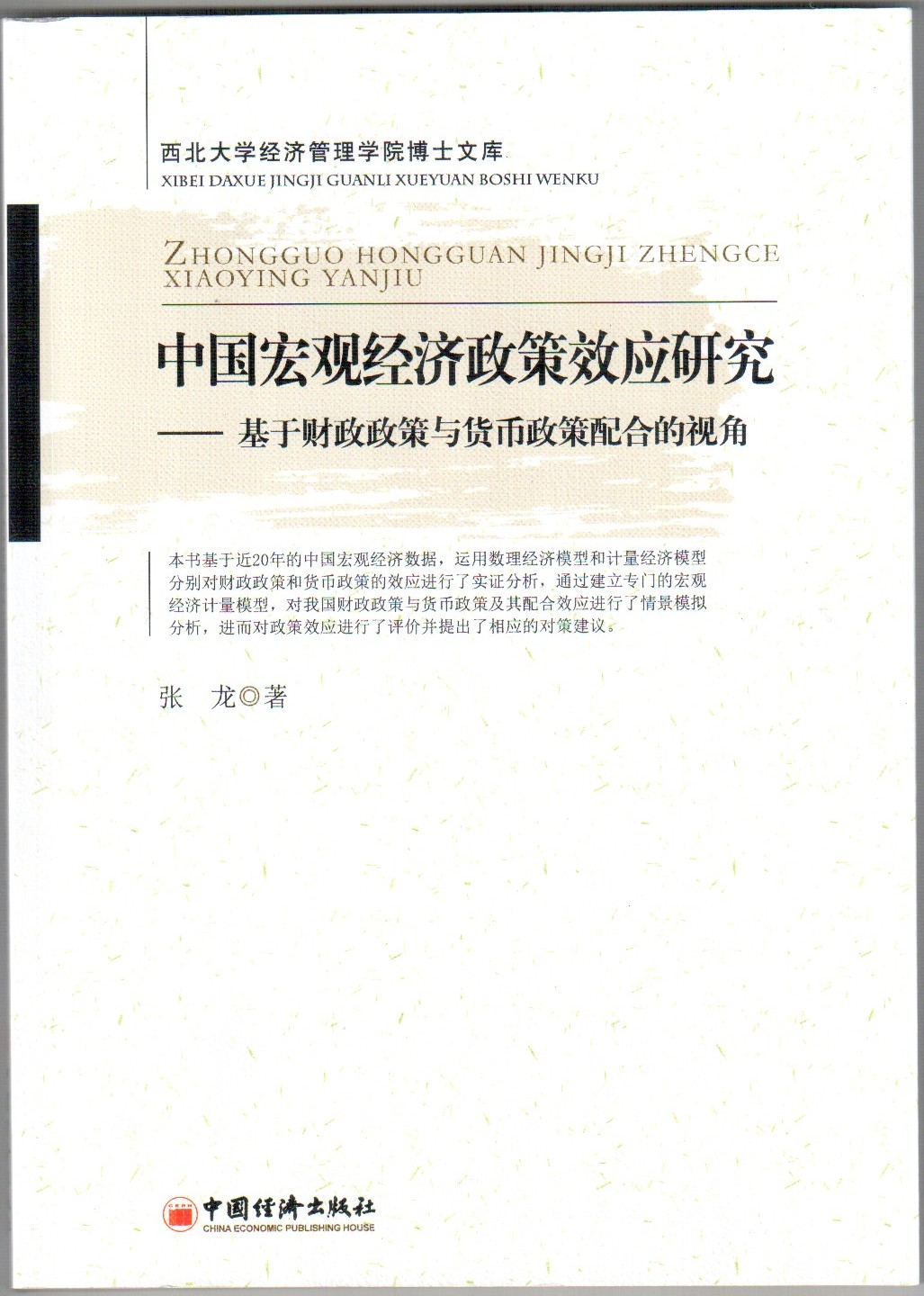 近日,永利集团官网数理经济与统计系张龙副教授的专著《中国宏观经济政策效应研究》由中国经济出版社出版,该书是永利集团官网陕西省重点学科西方经济学建设项目的研究成果。