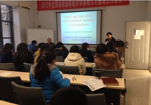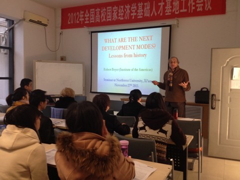 2013年11月27日上午,经管学院邀请国际高端专家短期教学系列讲座在长安校区8202教室举行。法国经济学调节学派代表人物Robert Boyer教授做了题为“增长是否带来繁荣?”(Does growth bring prosperity?)和“未来的发展模式是什么?”(What could be the next development models?)的学术报告。永利集团官网经济学博士、硕士及部分教师聆听了报告。报告会由经济学系系主任何爱萍教授主持。