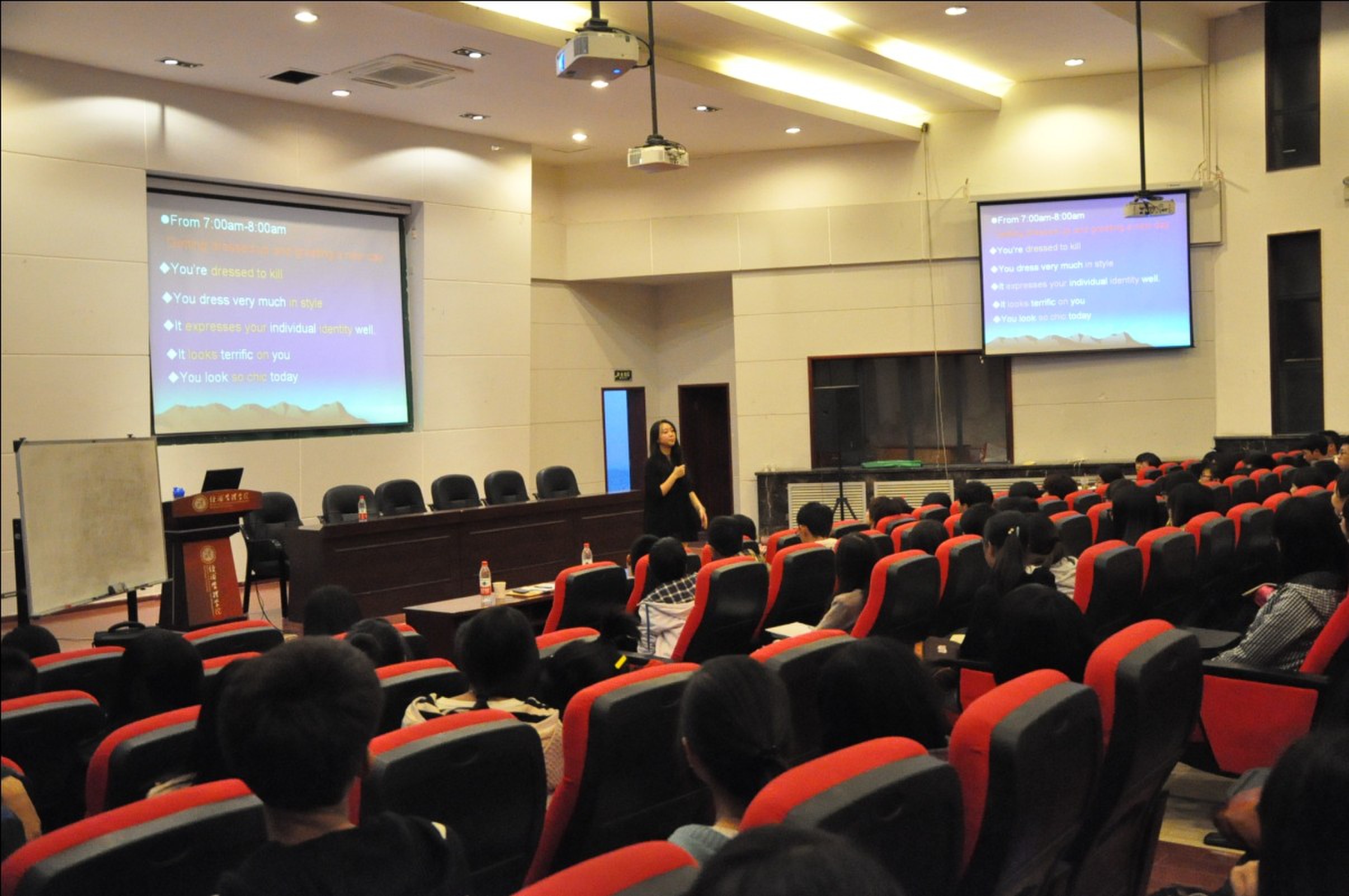 10月21日晚7点,永利集团官网“学问与人生”学生素质教育系列讲座(第八讲)暨第七届研究生学术月活动专家报告会之四在长安校区金海恒业报告厅举行,陕西翻译工作者协会理事,“同声传译委员会”副主任,原西安新东方综合部主管马维娜老师应邀作了题为《Passion & Initiatives》的报告。报告会由吴振磊副院长主持,院党委副书记李一凡、部分教师、博士生、研究生和本科生300余人到现场聆听了报告。
