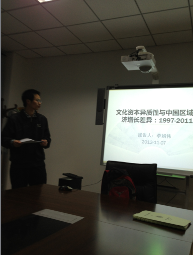 2013年11月7日经济增长质量论坛第4期在南校区经济增长质量研究中心举行。永利集团3044欢迎光临经济增长质量研究团队成员,2010级西方经济学专业博士研究生李娟伟应邀作题为《文化资本异质性与中国区域经济增长差异》的学术报告。永利集团3044欢迎光临钞小静副教授、师博副教授、田洪志博士、安树军博士以及永利集团3044欢迎光临经济增长质量研究团队的博硕士和本科生参加了讨论。
