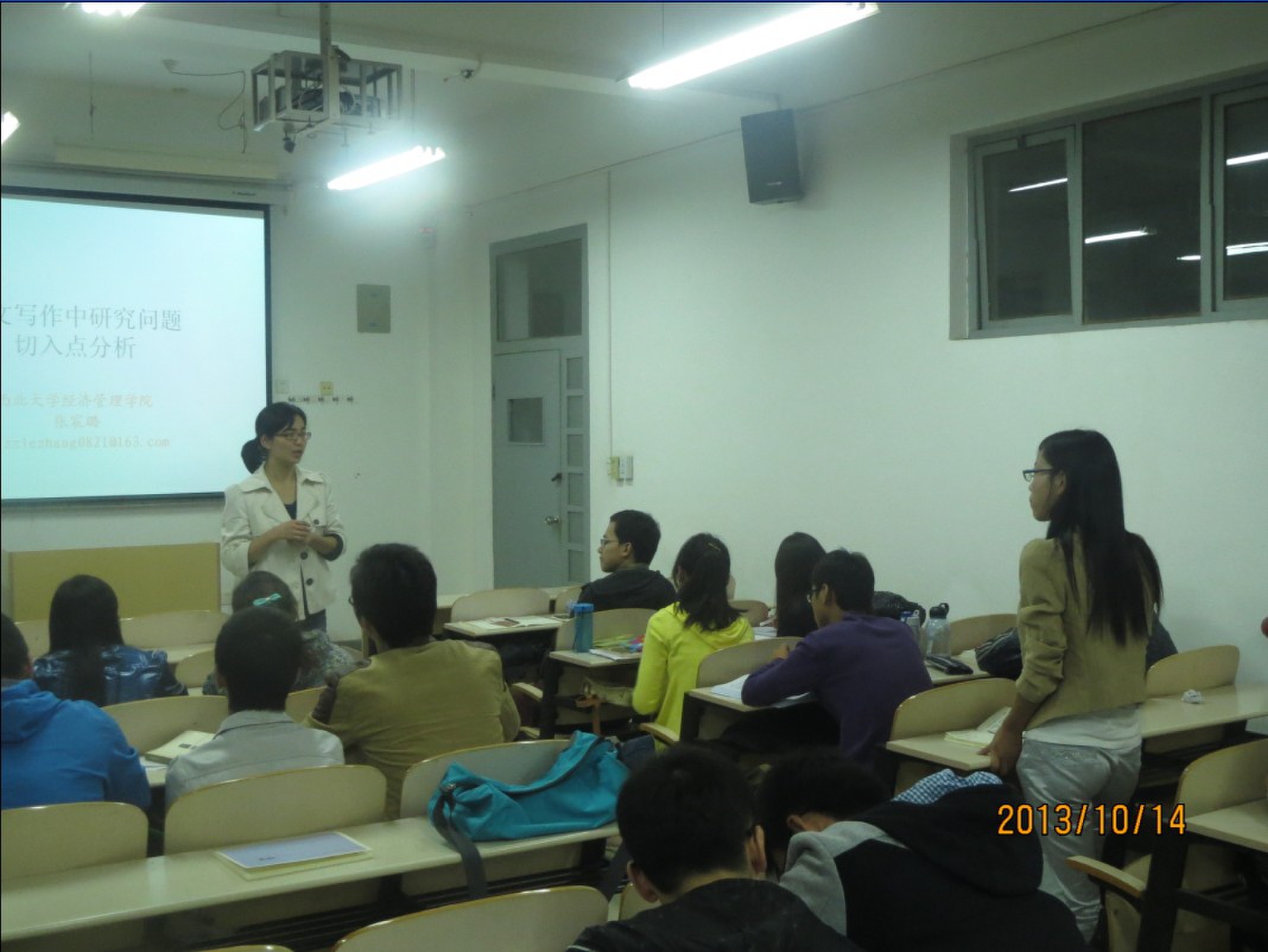 10月14日晚7点,永利集团官网“经曰管云”系列学术论坛第二十讲暨第七届研究生学术活动月学术讲座第四场开讲在长安校区1210教室举行,此次报告诚挚邀请到了工商管理系讲师张宸璐老师给同学们做了了题为《论文写作中研究问题切入点分析》的专题报告。