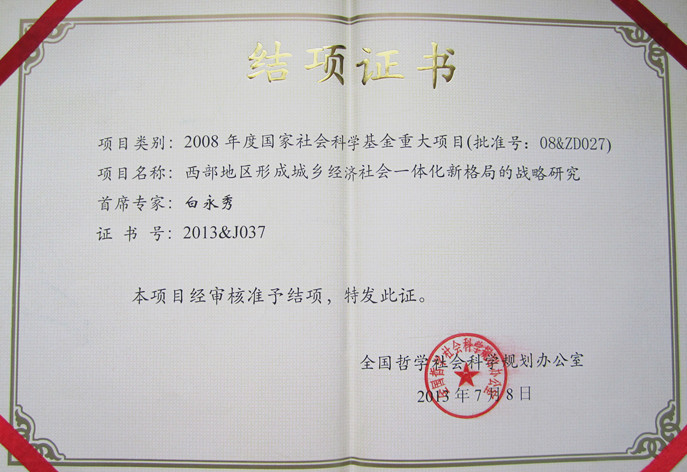 近日,经全国哲学社会科学规划办公室组织专家评审,永利集团官网白永秀教授担任首席专家的2008年度国家社会科学基金重大项目“西部地区形成城乡经济社会一体化新格局的战略研究”(批准号:08&ZD027)获准结项(结项证书编号:2013&J037)。