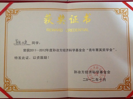 永利集团官网2010级西方经济学博士生魏婕于2012年2月通过申报材料初审,被选为该奖候选人。后于2012年3月至9月在中国社会科学院城市与竞争力研究中心实习。在实习期间参与《中国城市竞争力报告No.10》主报告的编写工作并任该书的主编助理,另参与了相关课题、学术研究以及会议等工作。由于实习期表现优异,受到一致好评,于2012年10月魏婕博士被授予2011-2012年度孙冶方经济学基金会“青年菁英奖学金”。