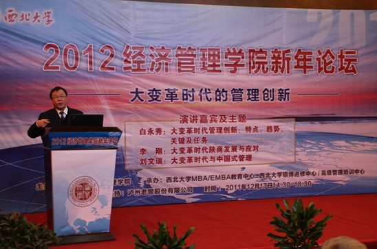活动分为两个模块,下午是以“大变革时代的管理创新”为主题新年论坛,晚上是以“E满新春”为主题的新年联谊会。在论坛活动环节,邀请到三位教授进行主题演讲:(1)白永秀教授的演讲题目是“大变革时代管理创新:特点、趋势、关键及任务”。白教授认为大变革时代就是管理创新的时代,大变革时代在创新层次、创新内容、创新方式等方面均呈现新的特点,管理创新显现5大趋势,管理者需要用30条定律来武装自己,以便应对大变革。(2)李刚教授的演讲题目是“大变革时代陕商发展与应对”。首先是陕商的发展过程,陕商是中国历史上最先产生的商帮,是天下第一商帮。接着讲述了陕商的重要活动,最后对大变革时代陕商应该树立8大核心价值观。(3)刘文瑞教授演讲题目“大变革时代与中国式管理”。刘教授从创新范畴界定入手,重点讲述中国式管理的内涵、特征及对中国式管理实践的反思。永利集团3044欢迎光临院长任保平主持了论坛并做了精彩点评和总结。此次论坛为学员认清时代特征,积极做好应对,促进管理人才的共同交流与提升提供了宝贵机会。