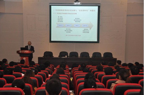 在讲座中,白永秀教授从四个方面阐述了他和他的团队所提出的“后改革时代”的学术观点:一是回顾了我国经济体制改革的四个阶段,分析了我国经济体制改革过程中获得成就和存在的问题,介绍了“后改革时代”提出的背景、理论渊源及其过程。二是明确指出:“后改革时代”不是指改革结束之后的时代,而是改革过程中的一个时代,是相对于前一时期的改革时代,是改革的延续。“后改革时代”的主题由“发展”转变为“和谐”,改革的性质和任务也将随着时代发展而发生了转变。三是论述了“后改革时代”中国经济改革与发展面临七大滞后和六大难点,指出:城乡经济社会一体化将成为新时期改革的关键,产权制度改革、解决行业垄断问题以及兼顾公平与效率将成为未来改革需要解决的重点问题。四是指出:“后改革时代”理论的提出不仅具有理论意义,更具备现实意义,对促进新时期改革的转型以及解决现实存在的诸如增长结构问题、分配结构问题、产业结构问题以及城乡结构问题等都将产生重要的作用。白永秀教授还在讲座中介绍了“后改革时代”理论在学术界引起的巨大反响和热烈讨论,并和在座师生进行了热烈而深入的互动交流。