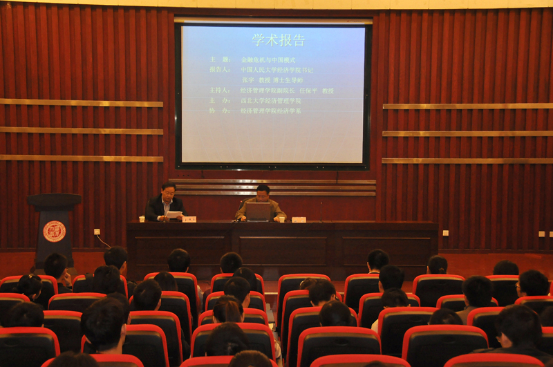 2009年10月26日晚7:00,中国人民大学经济学院党委书记、博士生导师张宇教授来永利集团官网作了一场“金融危机与中国模式”的学术报告,报告会由永利集团官网副院长任保平教授主持,学院部分教师、研究生及经济学系的本科生200多人参加。
