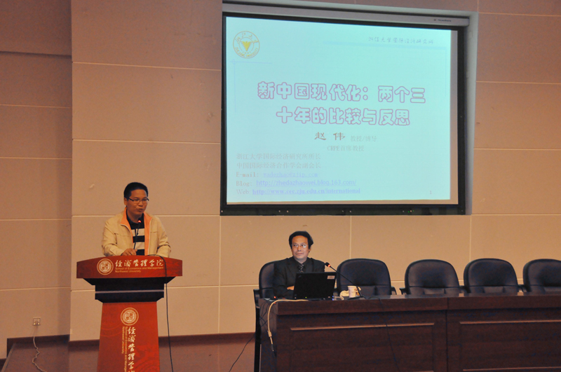 赵伟教授的报告分三部分展开。在报告的第一部分,赵伟教授介绍了“新中国两个三十年现代化进程的比较”,具体阐述了现代化的内涵、新中国两个三十年现代化进程的指标比较以及产生的成本。第二部分,赵伟教授阐述了“新中国两个三十年现代化进程的反思”,他认为现代化最基础的是经济发展,经济增长和产业体系优化是研究经济现代化的两个重要视点,中国两个三十年的现代化进程需要我们认真总结。第三部分,赵伟教授对中国的现代化进程做了展望,他认为中国现代化前景看好,具备持续发展的基础,但与此同时,中国现代化建设还需要不断深化改革。最后,赵伟教授回答了同学们关心的几个热点问题。