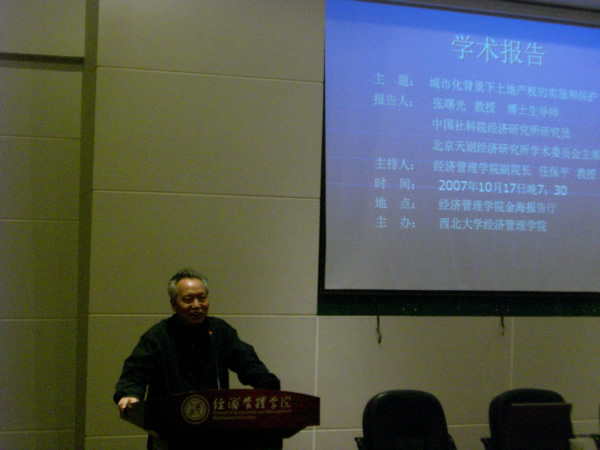 2007年10月17日晚7:30,中国社科院研究所研究员、北京天则经济研究所学术委员会主席张曙光教授来永利集团官网作了一场“城市化背景下土地产权的实施和保护”的学术报告。报告在永利集团3044欢迎光临长安校区金海报告厅举行,学院部分教师、研究生及经济学系的本科生200多人参加。
