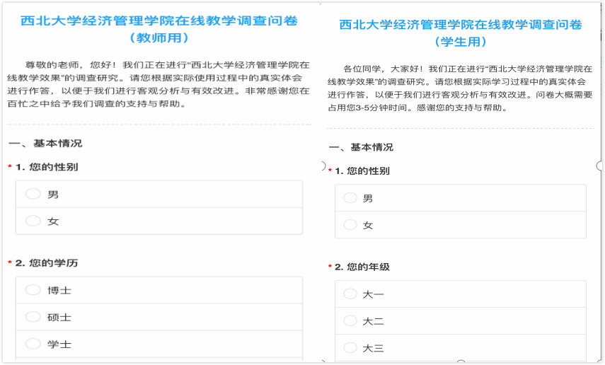 二是对开学首日的在线教学效果进行了问卷调查。针对课前资料发放、课中讨论互动和课后作业布置等三个影响线上教学质量的关键点,学院使用问卷星设计了《永利集团3044欢迎光临在线教学调查问卷(教师用)》和《永利集团3044欢迎光临在线教学调查问卷(学生用)》,从教师和学生两方面综合评估线上教学效果。首日课程结束后,共收到21份教师和1100余份学生的有效问卷。通过对问卷调查结果的分析,将首日在线教学中存在的问题及时反馈给教师。