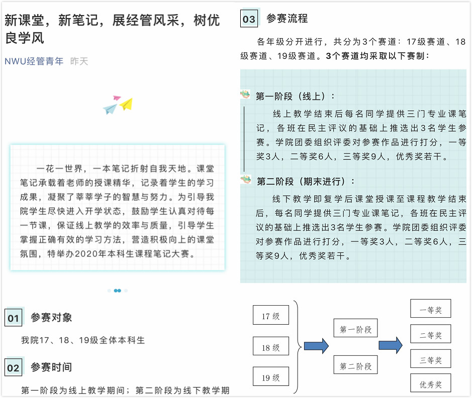 四是举办2020年本科生课堂笔记大赛。为引导永利集团官网学生尽快进入开学状态,鼓励学生认真对待每一节课,保证线上教学的效率与质量,引导学生掌握正确有效的学习方法,营造积极向上的课堂氛围,特举办2020年本科生课堂笔记大赛。