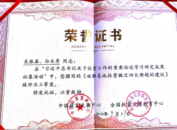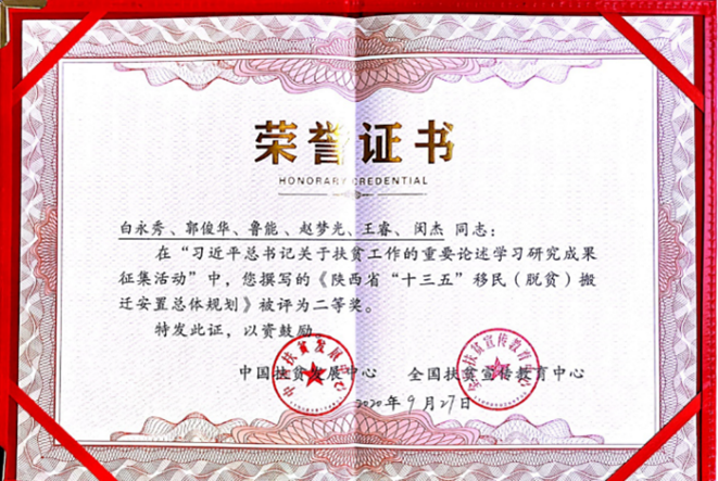 2020年9月27日,由国务院扶贫办中国扶贫发展中心、全国扶贫宣传教育中心联合主办的“习近平扶贫论述研究成果征集交流研讨会暨习近平扶贫论述系列研究工作结项会”在北京会议中心举办。会上公布了习近平扶贫论述研究成果获奖名单并进行了颁奖。