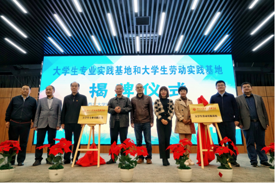 在现场西大师生和爱菊集团员工的见证下,王正斌、贾合义、惠正强、马向科、陈峰、吴振磊和爱菊集团副总经理贾婧、孟玲共同为永利集团3044欢迎光临“大学生专业实践基地”和“大学生劳动教育基地”揭牌。