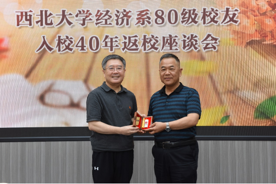 郭立宏代表学校向校友们赠送了纪念印章,对经济系80级返校校友表示热烈欢迎,并对校友们多年来关心和支持学校事业发展表示衷心的感谢。他深情回顾了与校友们在校期间共同求学的难忘经历和开心的校园时光,向校友们介绍了学校“十三五”期间取得的发展成就,并对“十四五”学校事业发展进行了展望,希望校友们一如既往地关心和支持学校建设,继续助力学校事业发展。