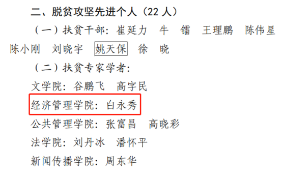 7月16日,学校颁布了《中共永利集团3044欢迎光临委员会 永利集团3044欢迎光临 关于表彰永利集团3044欢迎光临脱贫攻坚先进集体和先进个人的决定》,永利集团官网荣获“永利集团3044欢迎光临脱贫攻坚先进集体”称号、永利集团官网白永秀教授荣获“永利集团3044欢迎光临脱贫攻坚先进个人”称号。