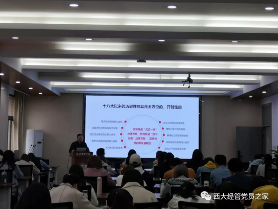 赵金哲作了“怎样成为一名合格的党员”的主题报告。他指出,入党积极分子要想成为优秀的共产党员,就要以共产党员的标准严格要求自己。作为经管人,各位入党积极分子要深入学习习近平新时代中国特色社会主义思想,并与自身实际相结合,在学习生活中做到“理论学习有收获”、“思想政治受洗礼”、“服务发展敢担当”、“情系师生解难题”、“清正廉洁做表率”。