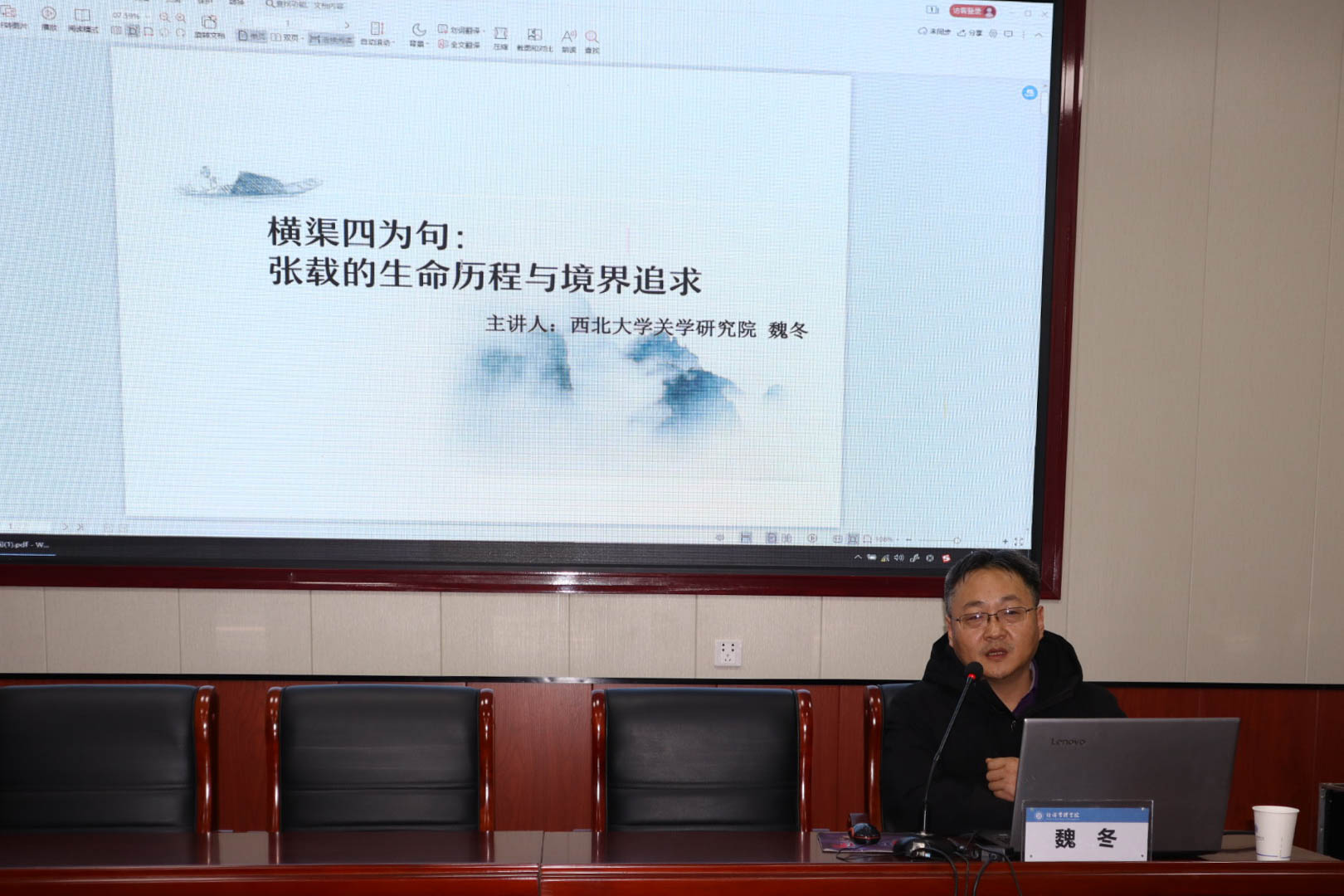 当天下午,参加共建活动的党员们来到眉县横渠镇张载祠,这是是我国北宋著名的思想家、哲学家、教育家、“关学”创始人张载的讲学之地。在巍巍终南山下,冬日的暖阳照射在古色的碧瓦青砖上,历尽岁月风霜的千年古柏仿佛在述说着关学历代先贤为民请命、为国治学的悠长故事。党员们到在讲解员的引导下,在不同的展厅了解关学文化的起源和发展,了解千年以来总关学弟子们在推动中华文化发展和文明进步所做的重要贡献。魏冬教授进行现场教学,以《横渠四为句:张横渠的生命历程与境界追求》为题做了讲座。他指出,关学作为中国传统文化的重要组成部分,有着非常重要的历史影响和现实意义。中国共产党人是中华五千年优秀传统文化的继承者、宣传者和发扬者。张载倡导的“为天地立心,为生民立命,为往圣继绝学,为万世开太平”这四句话与党的历史使命、根本宗旨、奋斗目标有内在一致性,关学精神的“勇”,更是中国共产党人有为担当的生动体现。