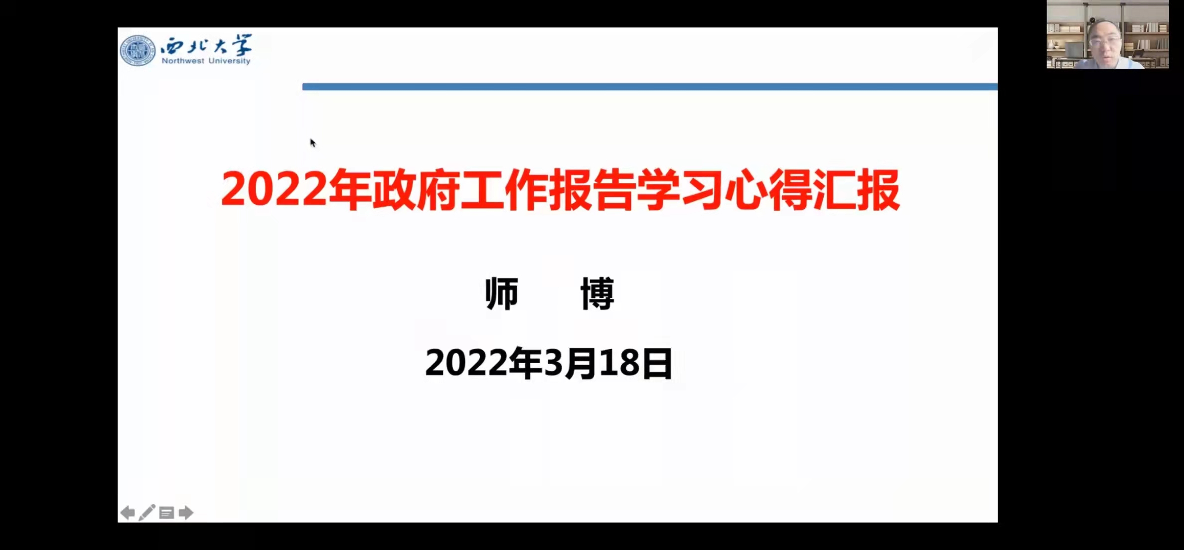 在学习中,学院副院长师博教授结合个人学习情况,向与会人员就《2022年政府工作报告》进行深入解读。他围绕2022年发展预期目标、政府九大工作任务两个方面内容,阐释了国家制定经济政策的学理性基础和现实选择。他指出,今年政府的工作和政策取向仍然是把贯彻新发展理念、构建新发展格局和推动高质量发展作为主线,将稳中求进的总基调贯彻到谋划经济发展的全局中,为当前实现经济质的提升和量的合理增长指明了方向。