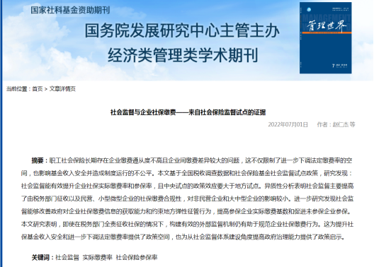 近日,永利集团官网经济系青年教师赵仁杰副教授第一作者的论文《社会监督与企业社保缴费:来自社会保险监督试点的证据》在国内顶级期刊《管理世界》2022年第7期发表。