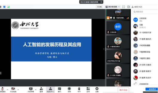 2022年7月11日至7月14日,数理经济与统计学系举行了以“人工智能专题讲座与科研写作技能训练”为主题的教学实践周活动。本次活动主要分为两部分,第一部分是学术讲座,邀请本系张涛副教授和马聪博士做了“人工智能”和“数学在经济学中的应用”相关主题的学术讲座;第二部分活动是读书观影学习,通过引导阅读《人工智能简史》等书籍,观看人工智能领域、博弈论领域著名学者传记,以及结合我国数字乡村建设和青年创业话题的影像等,并交流讲座内容、读书和观影心得。本次实践周活动共有两个专业六个班级160多名学生参加,活动目的在于让学生了解人工智能领域的发展历程以及现实应用情景,另外结合课程学习,引导学生将课本知识和现实问题结合。