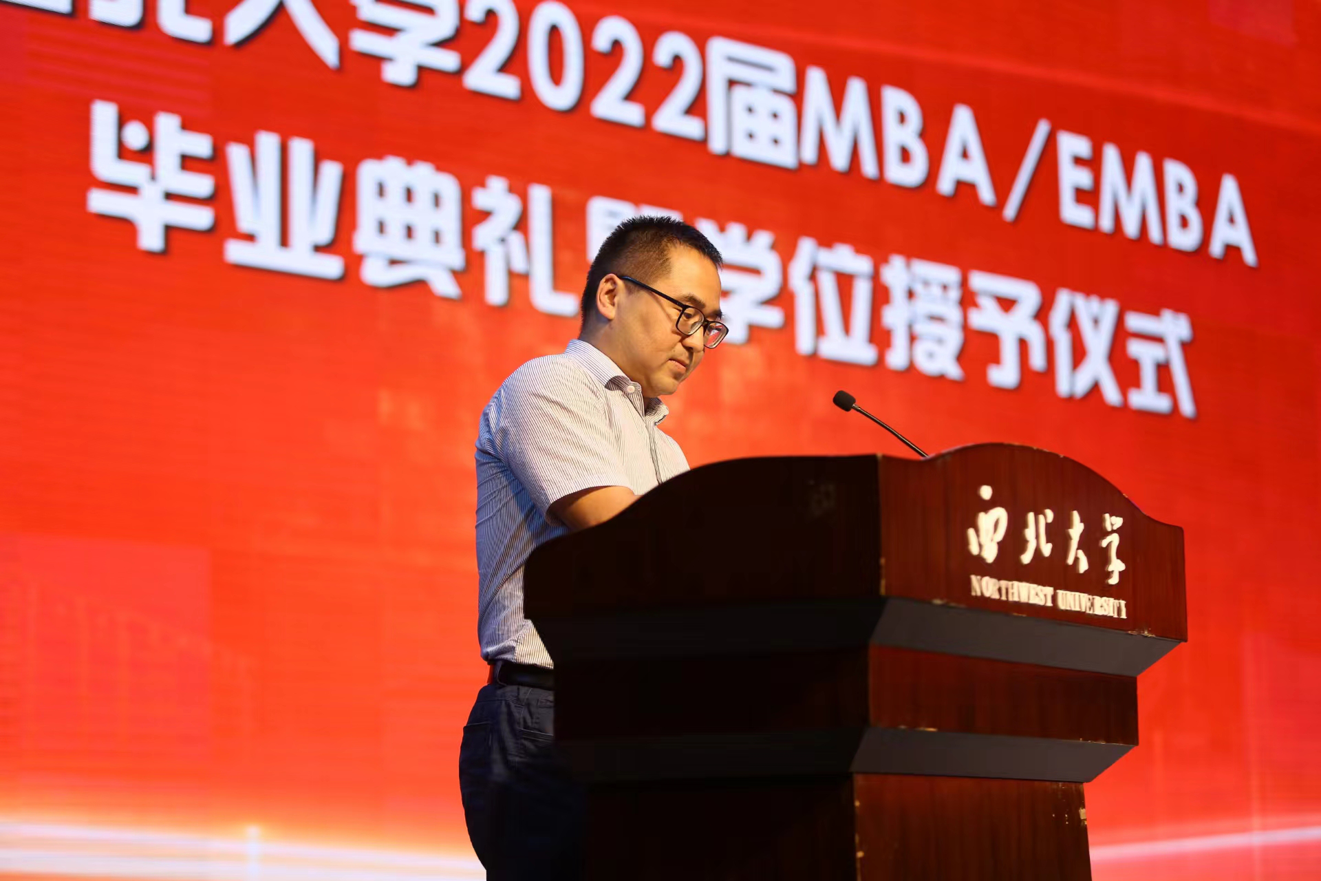 在第二阶段学位授予仪式上。研究生院副院长冯建涛宣读了永利集团3044欢迎光临学位委员会授予永利集团官网2022届毕业生学位授予决定和陕西工商管理硕士学院准予永利集团官网陕西MBA学生毕业决定。