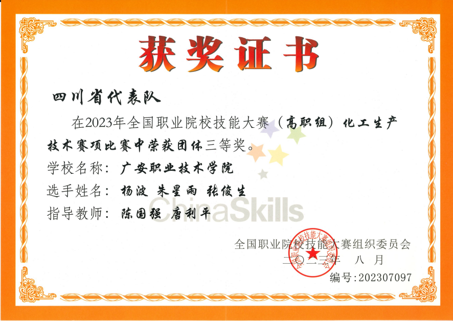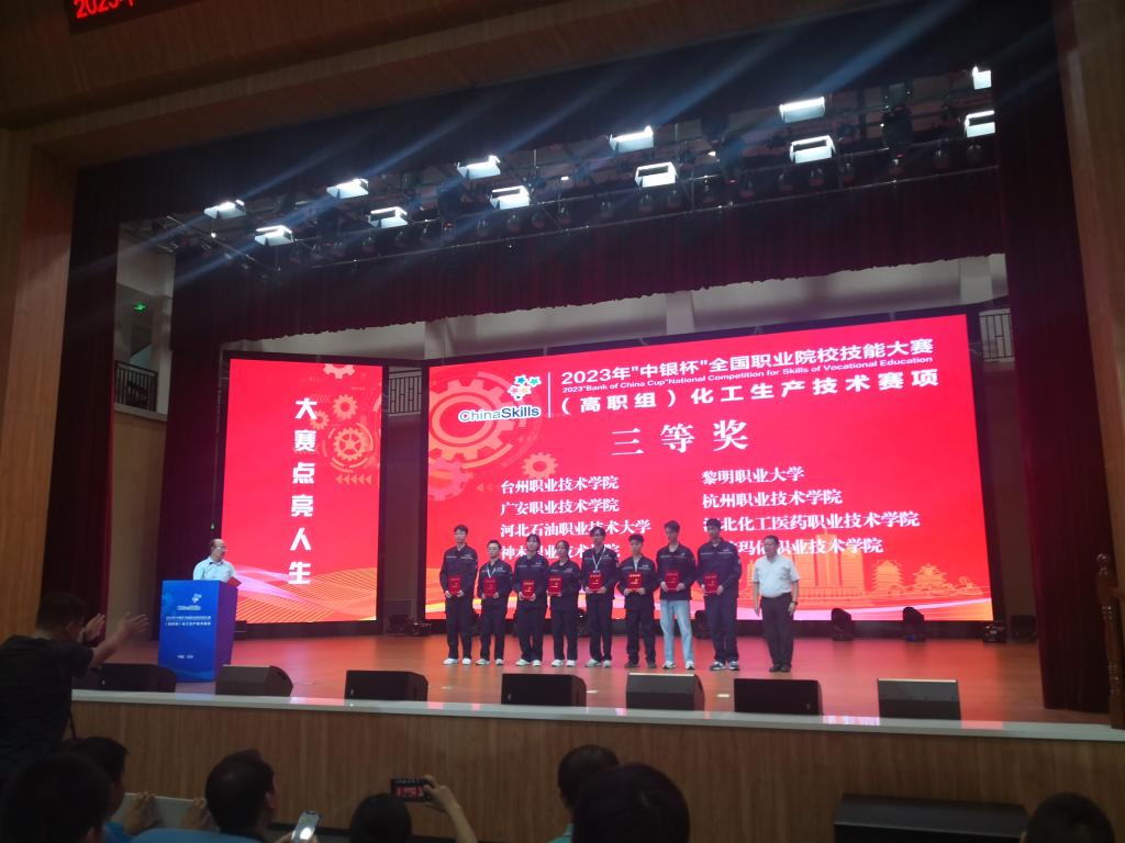 8月18日至8月22日,2023年全国职业院校技能大赛“化工生产技术”赛项在兰州石化职业技术大学举行。pp电子官网陈国强、唐利平老师指导的应用化工技术专业张俊生、杨波、朱星雨三位同学参加比赛,经过四天的激烈角逐,荣获国赛三等奖,实现了该赛项的新突破。