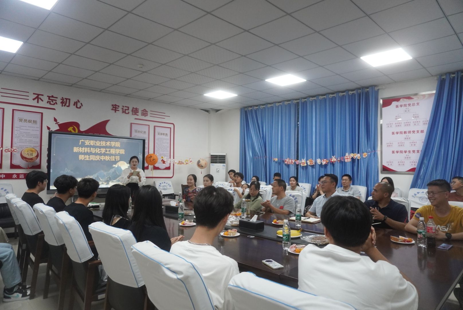 活动在段汶江、何雪峰老师合唱的《明月几时有》中拉开序幕,师生们纷纷拿出了才艺,为大家献上了一堂精彩纷呈的中秋晚会,赵小海博士、王广玉老师分别带来了传统的笛子演奏和流行的吉他弹唱,博得满堂喝彩,同学们演唱了饱含深情的《水星记》《关键词》和喜庆欢乐的《最炫民族风》。