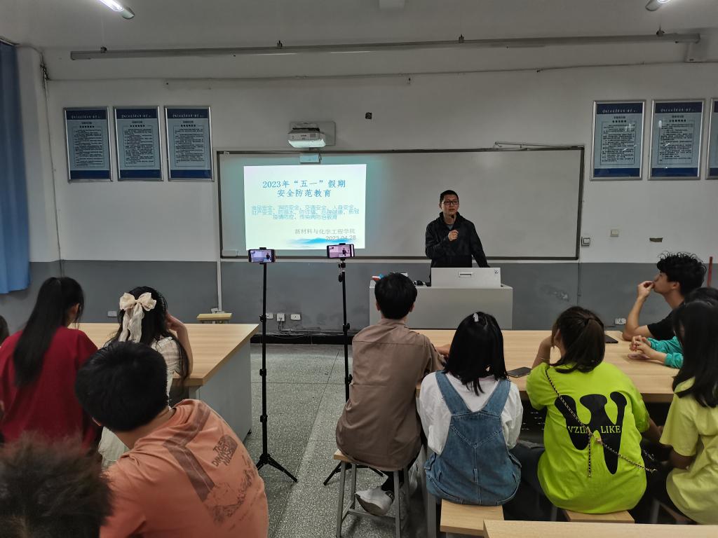 为进一步提升pp电子官网学生安全管理水平、推进安全文化建设﹑增强全体学生的安全意识,4月28日晚上19:30,学院通过线上线下相结合方式,在致用楼107开展了实验实训安全培训及“五一”假期安全教育,会议由副院长孔新海主讲,他从实验实训过程中涉及的水电气以及化学试剂等方面安全知识进行讲解,特别提醒学生要注意危化品使用和玻璃仪器设备规范操作等。陈国强、王丰两位老师就“五一”假期安全注意事项进行了防范教育。