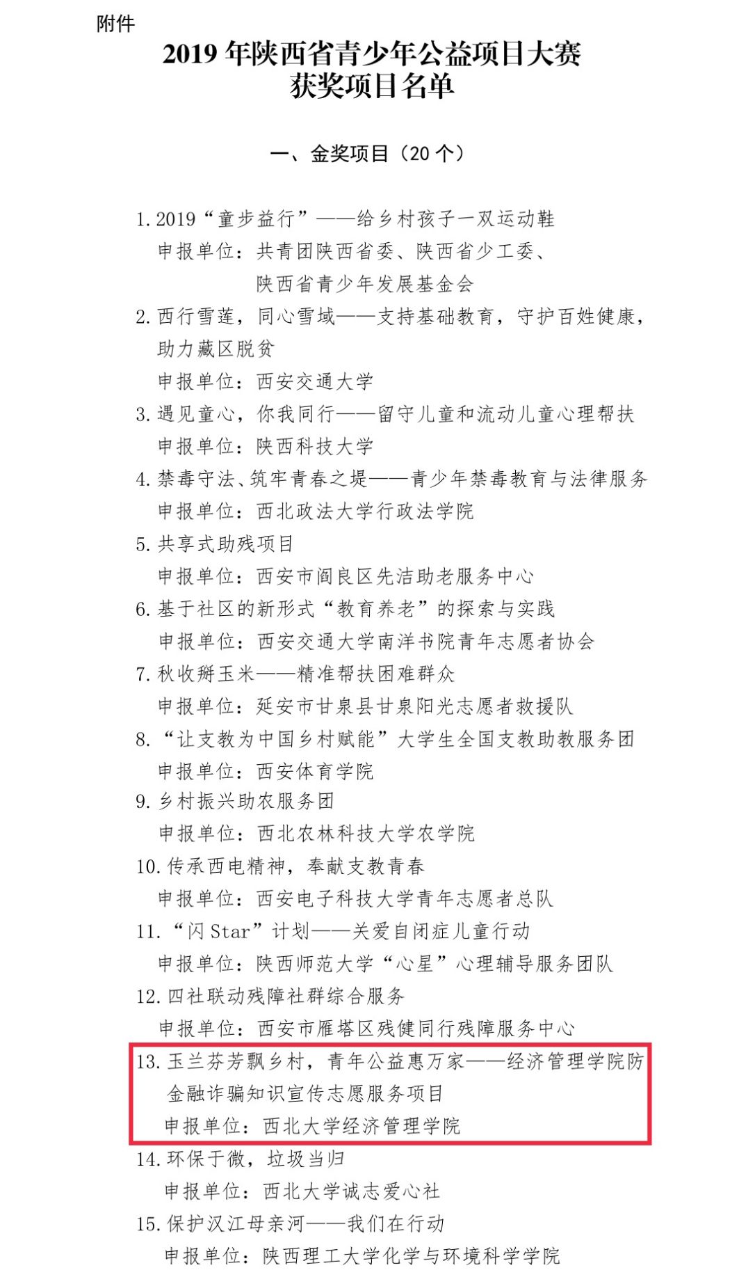 由永利集团官网团委史歌老师指导,2017级金融工程班安亭樾主持申报的项目《玉兰芬芳飘乡村,青年公益惠万家--永利集团3044欢迎光临防金融诈骗知识宣传志愿服务项目》,喜获2019年陕西省青少年公益项...